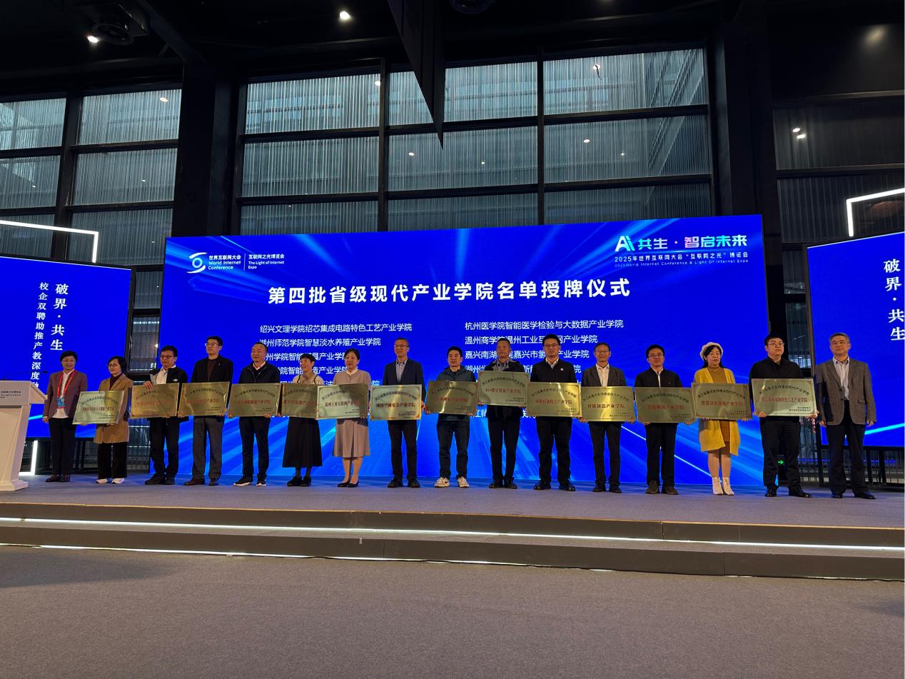 在大会的重要授牌环节中,我院网络空间安全产业学院荣获“浙江省第四批重点支持建设现代产业学院”称号,标志着学院在产教融合与高层次应用型taptap点点足彩稳赚方面获得省级高度认可。学院党委委员、工学院院长、产业学院执行院长倪应华受邀出席仪式并代表学院接收牌匾。