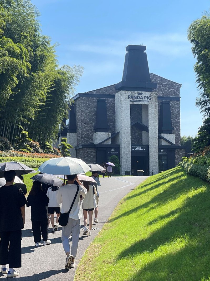 随后,师生一行跟随讲解员的脚步参观了金华两头乌猪博物馆和5G智慧养殖中心,品尝了特色套餐,更加直观地感受到企业的IP运营。博物馆以黑、白、粉三色组成,非常有时尚感,体现了国际潮流范,吸引了很多同学拍照打卡。养殖中心采用了国外进口的先进智能养殖设备,打造了世界上第一个5G数字化智慧牧场。